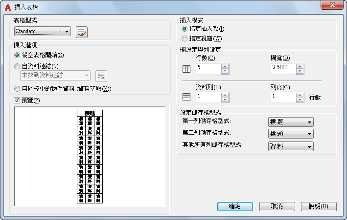 指定表格的大小與位置。您可以使用指向設備或於指令提示下輸入座標值。選取了此選項時,欄數與列數、欄寬與列高均取決於視窗的大小及欄與列的設定。