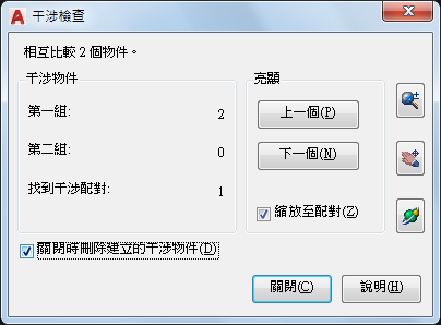 如果選取了該選項,則會關閉該對話方塊並刪除干涉物件。