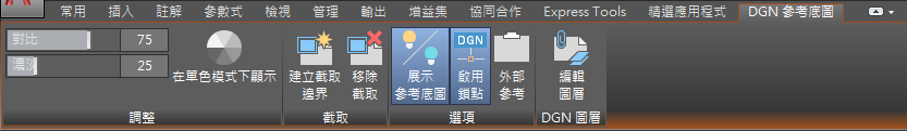 變更 DGN 參考底圖的顯示、截取、圖層和物件鎖點選項。