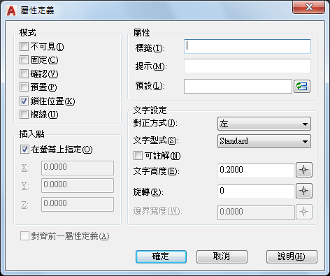 設定屬性文字的對正方式、型式、高度以及旋轉角度。