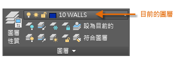 如您在圖中所見,圖層 10 WALLS 是目前圖層。所有新物件都會自動放置在該圖層上。圖層的清單中,10 WALLS 旁的綠色勾選會確認其為目前的圖層。