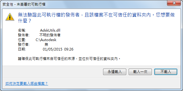 當載入已數位簽署的自訂程式檔時,AutoCAD 系列程式會確認數位簽章是否已貼附至檔案。顯示的訊息方塊會指示數位簽章是否可驗證,以便使用者決定是否要將程式檔載入圖面環境。
