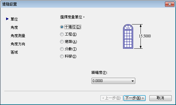 「快速設置」精靈包含兩個頁面:單位和區域。當您在此精靈中作業時,選取「上一步」和「下一步」可以切換畫面; 選取最後一頁的「完成」可以關閉精靈,並以您指定的設定來建立新圖面。