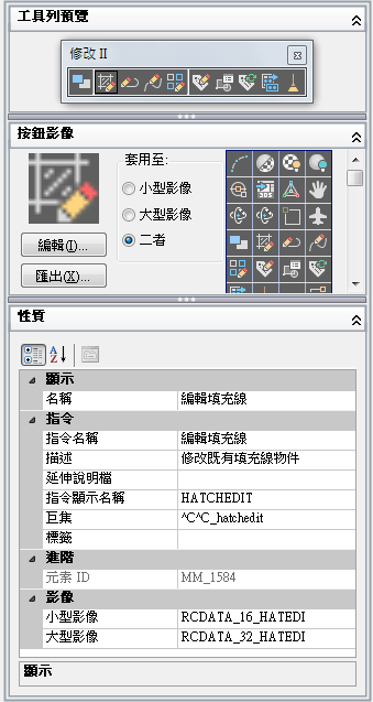「動態顯示」窗格顯示在「自訂位置」窗格選取的使用者介面元素預覽。它可讓您編輯在「指令清單」窗格中選取的指令影像,以及在「自訂位置」或「指令清單」窗格中選取之項目所特定的性質。