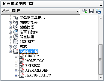 樹狀檢視用於建立並管理使用者介面元素。在建立使用者介面元素之後,您就可以將指令從「指令清單」窗格拖曳至元素中,以加入該指令。您也可以在樹狀檢視中向上和向下拖曳指令,以變更其在功能區面板或工具列等使用者介面元素的顯示順序。