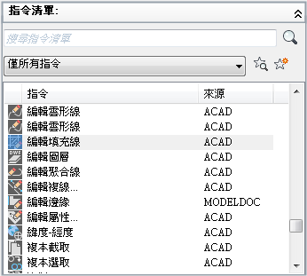 「指令清單」窗格包含可在目前載入的 CUIx 檔中使用的所有指令。您可以選取既有指令從清單以修改其性 質」或「建立新指令」。如果您想要建立新指令,指令會加入 CUIx 檔,並顯示在「<檔名> 中的自訂」窗格頂部附近的下拉式清單中。