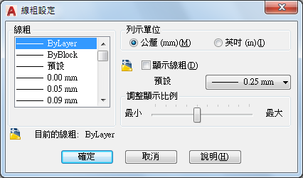 設定目前的線粗和線粗單位,控制線粗的顯示及其顯示比例,以及設定圖層的 DEFAULT 線粗值。