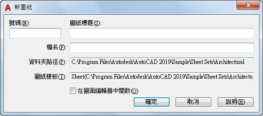 指定圖紙號碼。建議您第一次建立圖紙時,不要填寫圖紙號碼。依預設,新圖紙的圖面名稱和配置名稱將為圖紙號碼及圖紙標題。
