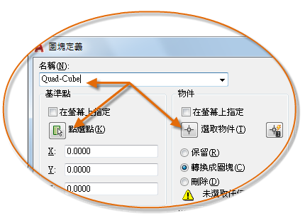 3. 輸入圖塊的名稱,在此例中是「四方立方體」。