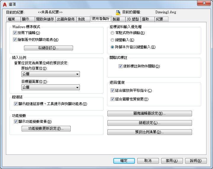 顯示「右鍵自訂」對話方塊。該對話方塊為「繪圖區」選項中的「快顯功能表」提供了進一步的定義。(SHORTCUTMENU 系統變數)
