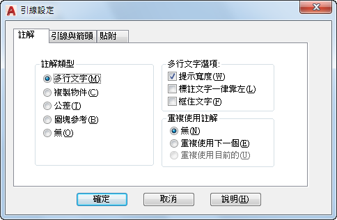 「引線設定」對話方塊包括以下頁籤:「註解」、「引線與箭頭」、「貼附」