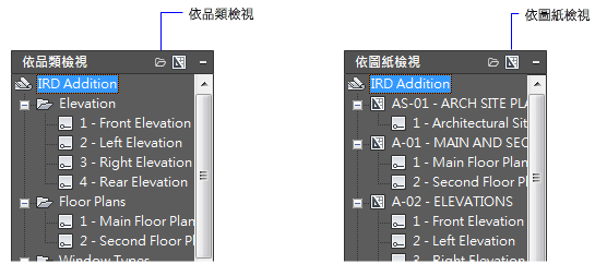 在「圖紙清單」頁籤上,可以將圖紙排列到子集集合中。在「圖紙視圖」頁籤上,可以將視圖排列到品類集合中。