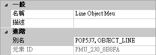 若要插入與所選物件或相同類型物件有關的功能表選項,請務必使用別名 OBJECT_objectname 或 OBJECTS_objectname。objectname 必須是有效的物件名稱,並符合快顯功能表要顯示物件的 DXF™ 字碼 0。例如,如果您想要在選取 LINE 物件時,顯示快顯功能表的功能表選項,請使用別名 OBJECT_LINE。
