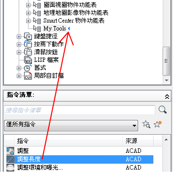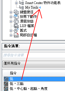- 在「指令清單」窗格中,將要加入的指令拖曳至「<檔名> 中的自訂」窗格中的快顯功能表。