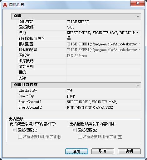 顯示所選圖紙所特有的資訊,例如,圖紙標題、圖紙號碼,以及是否包括在發佈作業中。還顯示自訂性質 (如果有)。