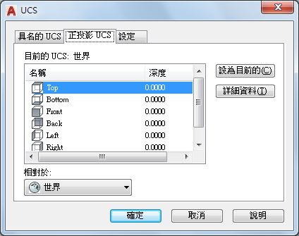 列示目前圖面中定義的六個正投影座標系統。正投影座標系統是根據「相對於」清單中所指定的 UCS 定義的。