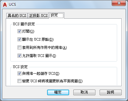 列示、更名和還原使用者座標系統 (UCS) 定義,以及控制視埠的 UCS 和 UCS 圖示設定。