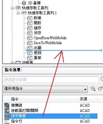 3. 在「指令清單」窗格下,將要加入的指令或控制項拖曳至「< 檔名 > 中的自訂」窗格中的「快速存取工具列」。