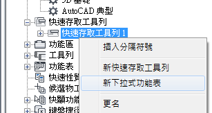 1. 在「自訂」頁籤的「<檔名> 中的自訂」窗格內,於「快速存取工具列」節點上按一下右鍵。按一下「新快速存取工具列」。