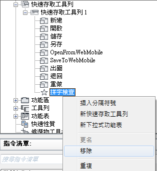 3. 在您要移除的指令或控制項上按一下右鍵,然後按一下「移除」。