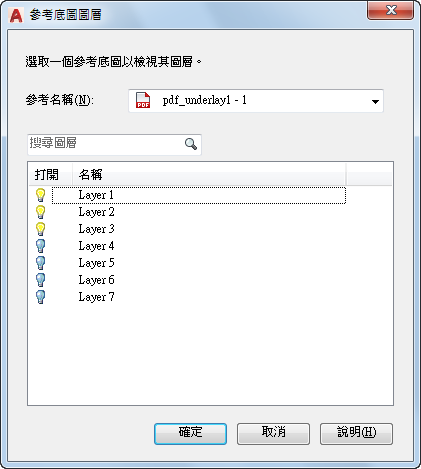 使用 DWFLAYERS、PDFLAYERS、DGNLAYERS 或 ULAYERS 指令或在選取的參考底圖上按一下滑鼠右鍵,並於快顯功能表上按一下圖層。