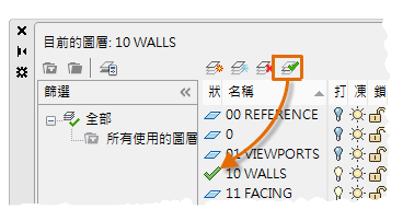 所有新物件會在目前圖層上進行繪製。「圖層性質管理員」上的綠色勾選標記會指出目前圖層。