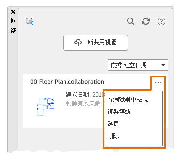 「共用視圖」選項板提供方式來顯示圖面的共用視圖,以及透過 Autodesk 網頁版和行動版帳戶張貼和回覆給同事和客戶的註解。
