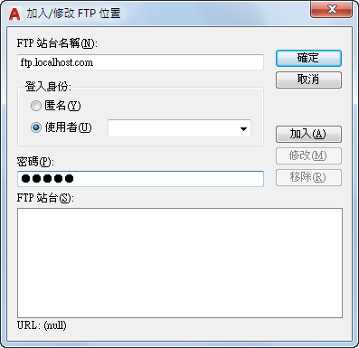 如要存取「加入/修改 FTP 位置」對話方塊,請在標準檔案選取對話方塊中,選擇「工具」「加入/修改 FTP 位置」。