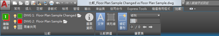 在比較結果圖面中的每個變更組周圍顯示修訂雲形。無論是否顯示修訂雲形,變更組都相同。