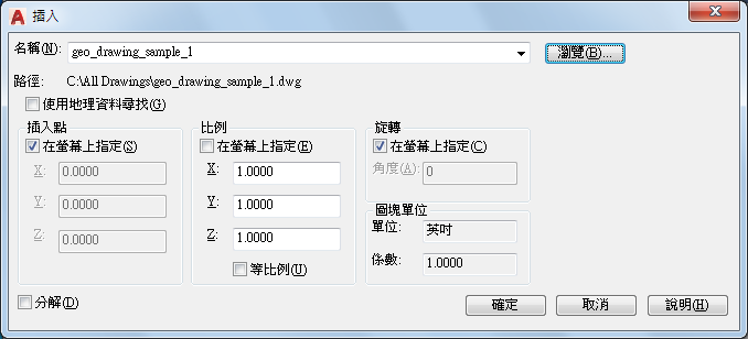 指定要插入的圖塊名稱,或要插入做為圖塊的檔案名稱。