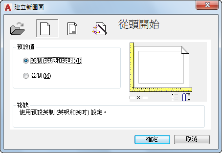 使用預設英制或公制設定啟動一個空圖面 (MEASUREINIT 系統變數)。使用 MEASUREMENT 系統變數可以變更給定圖面的測量系統。啟動程式時開啟的 Drawing1.dwg 是從頭開始的一個圖面。
