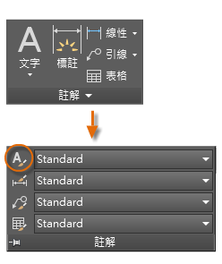 和許多其他註解功能一樣,多行文字也提供大量的設定。在使用 STYLE 指令將這些設定儲存成文字型式之後,您便可以按一下「註解」面板上的下拉式箭頭,存取已儲存的文字型式。目前的文字型式已顯示在下拉式清單的頂端。