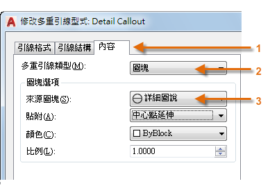例如,若要建立「詳圖圖說」型式,請啟動 MLEADERSTYLE 指令。在「多重引線型式管理員」中,按一下「新建」,然後選擇新多重引線型式的描述性名稱。按一下「內容」頁籤,選擇「圖塊」,然後選取所示的「詳圖圖說」。