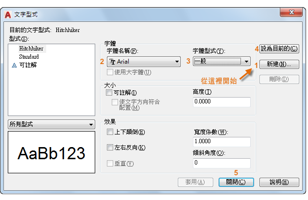 提示: 將任何新的或變更的文字型式儲存在圖面樣板檔。然後您就可以在新圖面上直接使用以節省大量的時間。