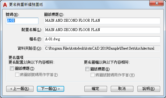 將下一張圖紙載入該對話方塊。這樣會提供一種為一系列圖紙重新編號或重新建立標題的簡便方法。*