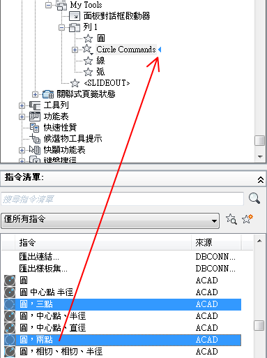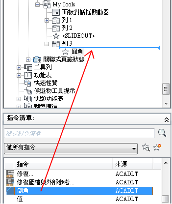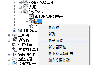 - 將新功能區面板從右側「<檔名> 中的自訂」窗格拖曳至左側「<檔名> 中的自訂」窗格中已載入 CUIx 檔的「面板」節點。