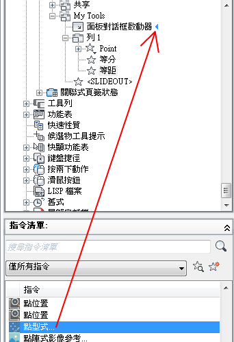- 將指令從「指令」清單拖曳至面板上的「面板對話方塊啟動器」。