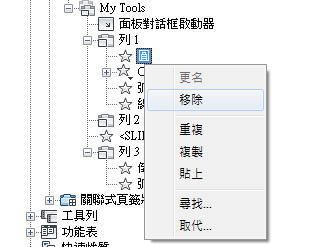 - 在您要移除的指令或控制項上按一下右鍵。按一下「移除」。