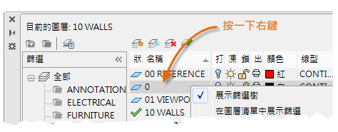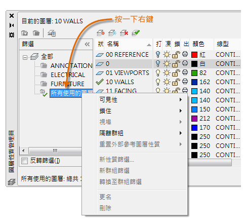 移除選取的圖層篩選。您無法刪除「全部」、「所有使用的圖層」或「外部參考圖層」篩選。