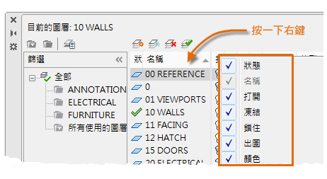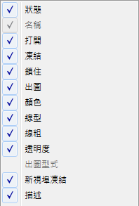 依名稱列示所有欄。勾選標記表示該欄會包含在顯示中。按一下欄名稱以顯示或隱藏欄。僅當配置視埠處於作用中時,可以使用視埠凍結、視埠顏色、視埠線型、視埠線粗以及視埠出圖型式。