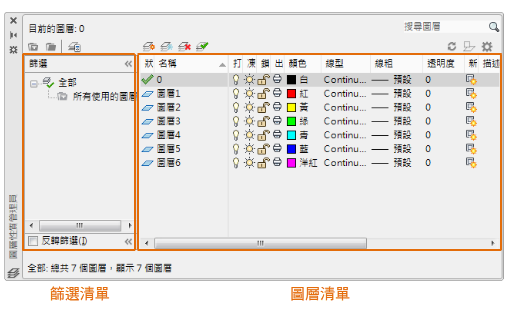 您可以加入、刪除和更名圖層;變更圖層性質、設定配置視埠中的性質取代以及加入圖層描述。