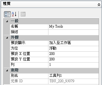 註: 在此處變更工具列性質僅會在載入自訂 (CUIx) 檔之後影響工具列的初始外觀。建議您使用工作區來控制工具列的外觀。