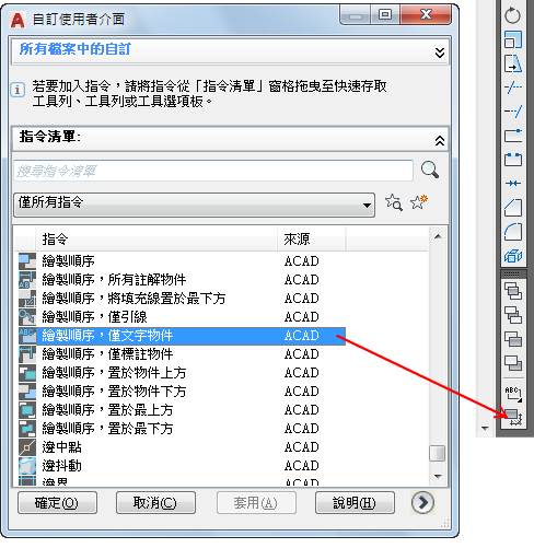 4. 在「指令清單」窗格中,將要加入的指令拖曳至「<檔名> 中的自訂」窗格中的工具列。