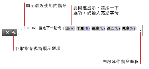 可停靠且可調整大小的指令視窗接受指令及系統變數,並顯示提示來協助您完成指令序列 (包括在另一個位置啟動的指令,例如功能區)。