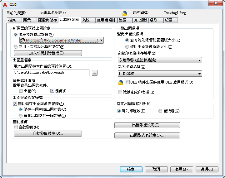指定是否將圖面自動發佈成 DWF、DWFx 或 PDF 檔。您還可控制用於自動發佈的選項。