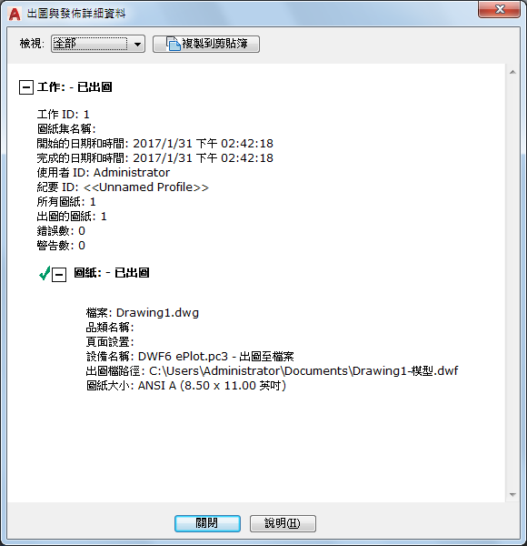 顯示所有已完成的出圖與發佈工作,以及這些工作內圖紙的相關資訊。