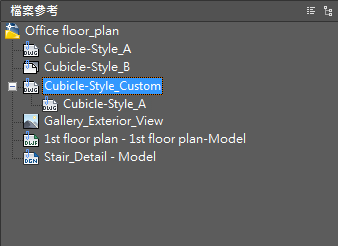 樹狀視圖的頂層永遠展示目前圖面。參考檔案顯示在下一層。可以開啟包含自己的巢狀檔案參考的參考檔案,以展示更深層級。在樹狀視圖中進行選取時,一次只能選取一個檔案參考。