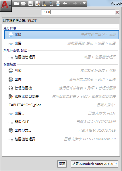 「指令搜尋」欄位會顯示在應用程式功能表的頂部。搜尋結果可能包括功能表指令、基本工具提示和指令提示文字字串。您可以輸入任何語言的搜尋條件。結果會套用至目前的工作區。