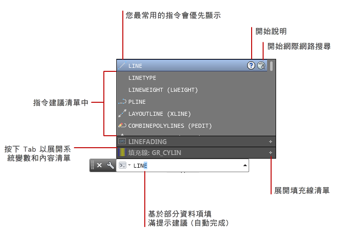 當您在指令視窗中或是動態輸入方塊中輸入指令的前幾個字母時,建議的指令清單會隨即顯示。依預設,清單具有以下特性: