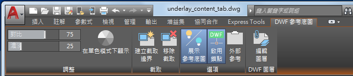 選取圖面中的 DWF 參考底圖時,功能區上會顯示「DWF 參考底圖」關聯式頁籤。